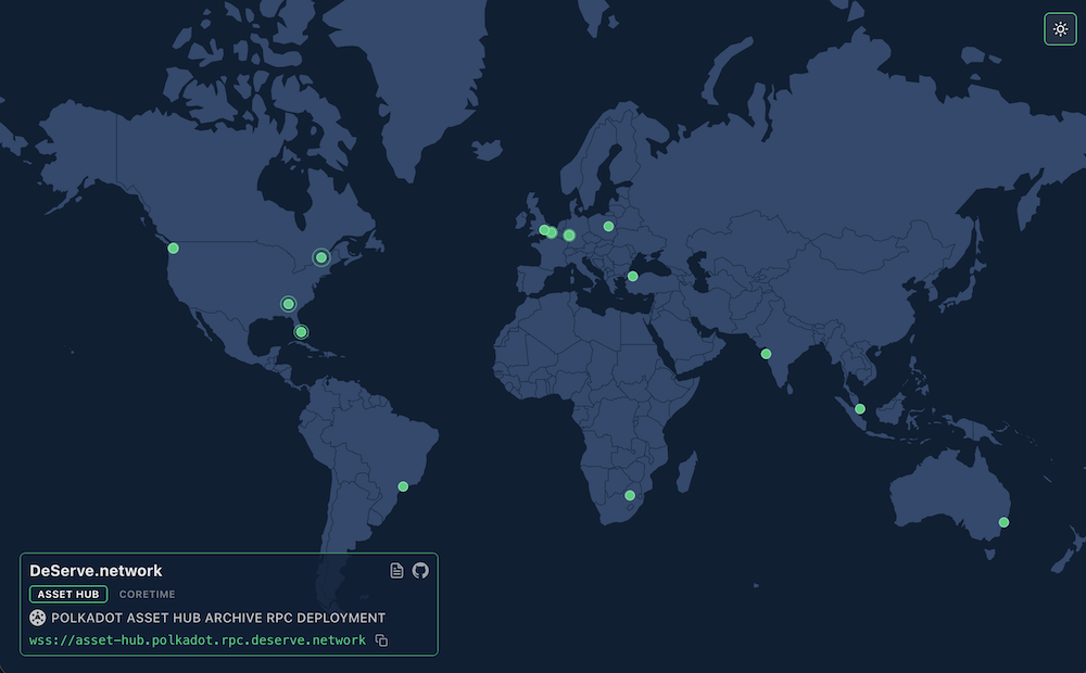 DeServe is a progressively decentralized infrastructure services network, launched on Polkadot March 31, 2026. Its initial deployment provides a global archive RPC network for Polkadot Asset Hub with Ethereum-compatible RPC support, and Polkadot Coretime, across 14 locations and 6 continents, with a 15th location in Tokyo currently being deployed. Coverage is expanding to additional Polkadot system parachains, with Coretime currently rolling out.